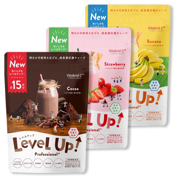 - レベルアップ プロフェッショナル プラス フレーバー3種セット [ ココア / イチゴミルク / バナナミルク ] (カルシウム/鉄分/ビタミン ) 15杯分×3