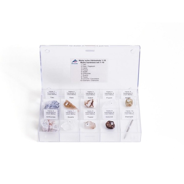 - Ordinal hardness scale according to Mohs with minerals in assortment box of hardnesses 1-10.