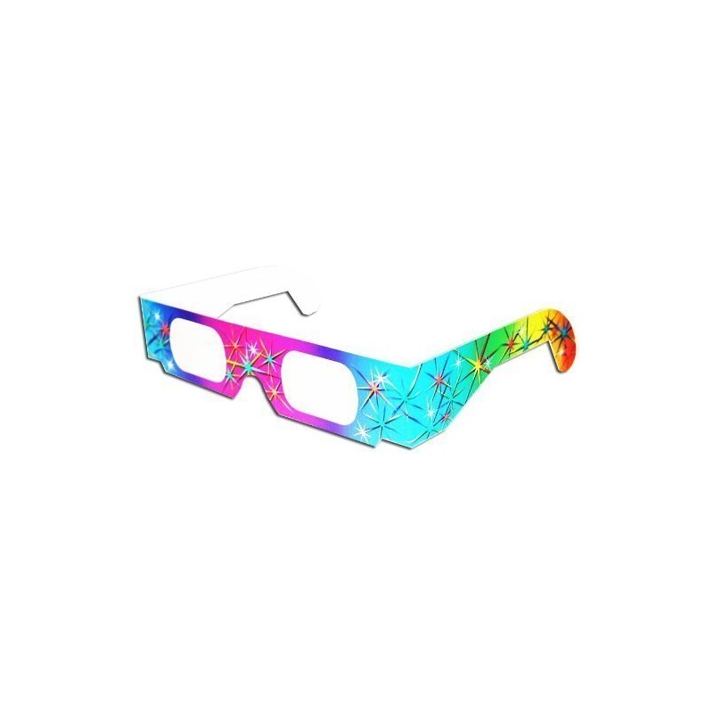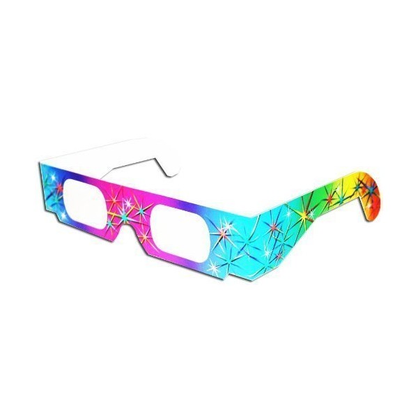 Quantity: Pack of 25 Light up your holidays or ANY day with 3-D FireworksTM glasses. The light show for your face that's great for all occasions, party favors, and holidays! These eye-opening glasses have specially treated lenses that enhance all fireworks shows, laser displays, and holiday light shows. Multi-starbursts of three-dimensional rainbows will race at you, sending chills up your spine and boggling your mind. Diffraction Grating lenses split the light spectrum into all the colors of the rainbow... like a prism! These awesome glasses Come in Bright Rainbow colored frames. Top Uses for 3-D Fireworks Glasses: Independence Day Labor Day Christmas Hanukah New Year's Eve Fireworks/Holiday Light Displays Laser Light Shows Party Favors Reunions The Light Show You Wear on Your Face