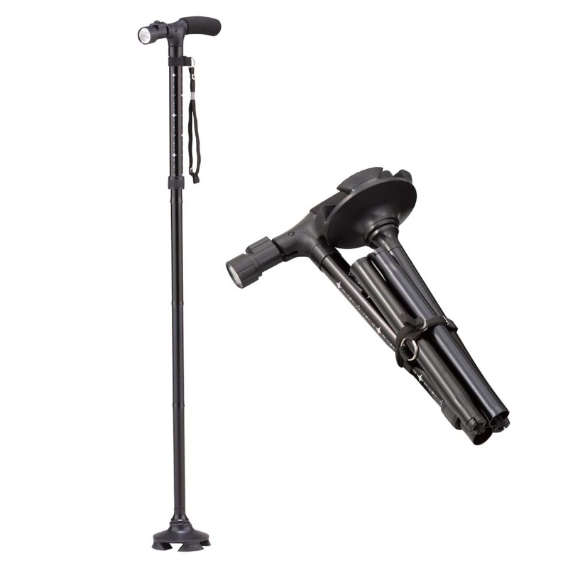 4点自立お洒落ステッキ ブラック LEDライト 収納袋付き 杖 長さ調整 5段階 軽量 アルミ製 回転式台座 折りたたみ SGマーク 安全基準適合品 男女兼用 高齢者 介護 用品 夜間散歩
