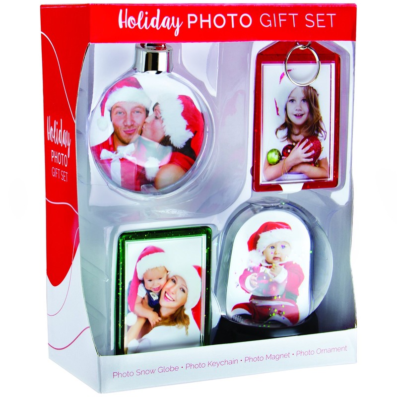 - Four items are included in this gift set: a photo ornament ball, snap-in photo keychain, snap-in picture frame magnet, and a mini photo snow globe. All items are made out of a high quality plastic, and can hold either 1 or 2 photos