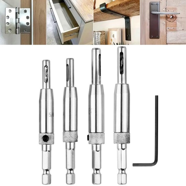 - 4PCS SELF CENTERING DRILL BIT: Our quick release drill bit guide set help you drill precisely. With our custom drill bits, you can easily achieve precise and centered holes, ideal for woodworking. Hinge drill bit self centring will be a good assistant for you. Come and try our shank hinge drill bit guide set