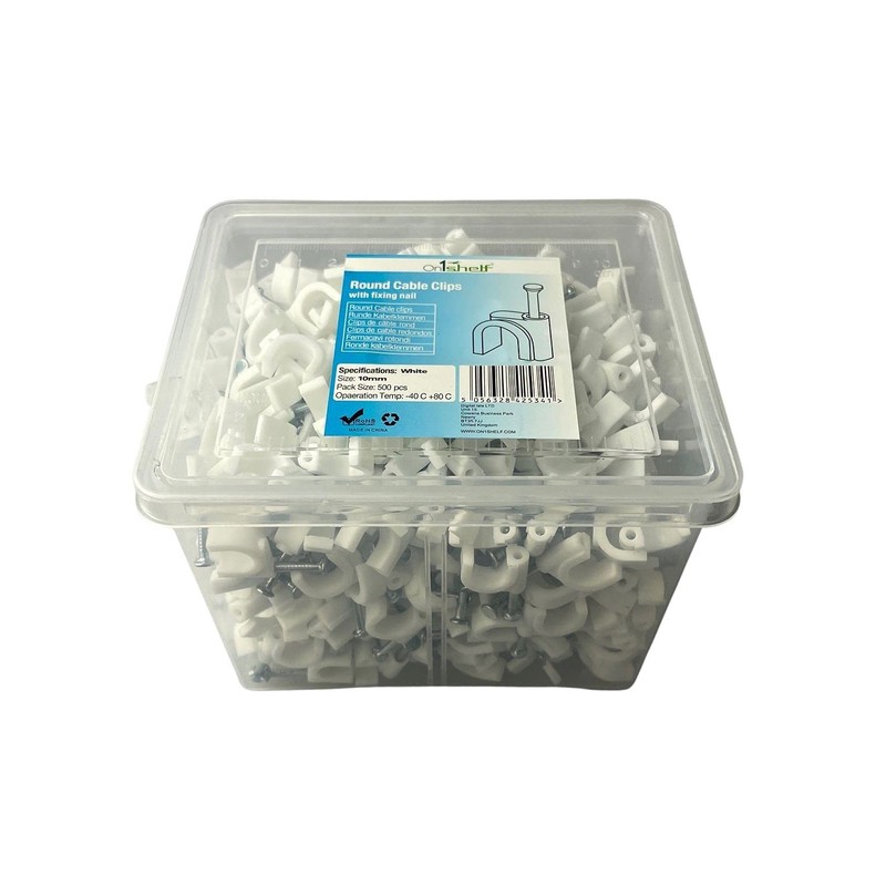 Round cable clips K-Type are designed for easy grip, dimensional compatibility and stability at high and low temperatures. With an impact-resistant nail to attach to a wire, these versatile clips are perfect for industrial building installation, computer construction, and office buildings underground and at a high level.