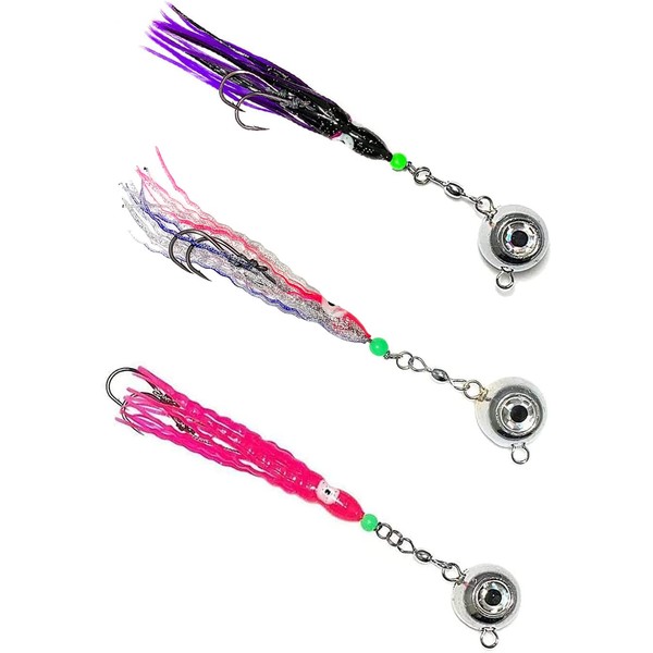 Fluke Ball Jigs with Hoochie Stinger Rigs 5oz, 3 Sets Rigged, for Saltwater & Freshwater Fishing, Includes Storage Bag, Ideal for Fluke, Striper, Bass & Inshore Game Fish