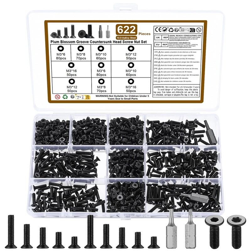 620-Piece M3 Screw Set, Countersunk Screws Set, Countersunk Hex Socket Screw Set + Torx Countersunk Thread Screws Set, Black Metric Flat Head Full Thread Countersunk Screws Set, with 2 Bits