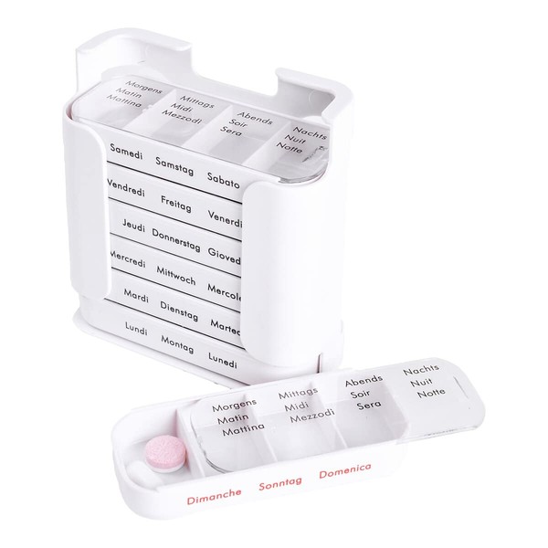 - Pill dispenser for every day of the week and with 4 compartments for each time of day. Once filled, it is enough for the whole week. Easy to open, even if you are not so movable. Plastic holding box 12 x 5 x 13 cm.