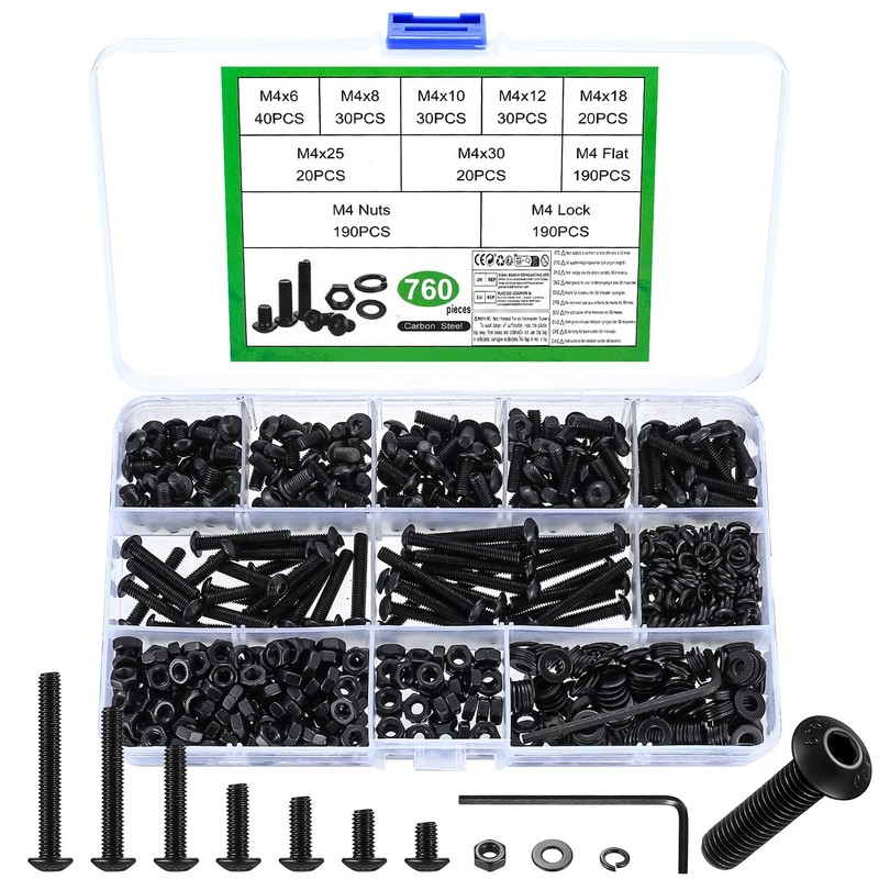 760 Pcs M4 Bolts and Nuts Set, Nuts and Bolts Set, Black Hex Socket Button Head Cap Screws with Washers, Assorted Pan Head Screws (M4)