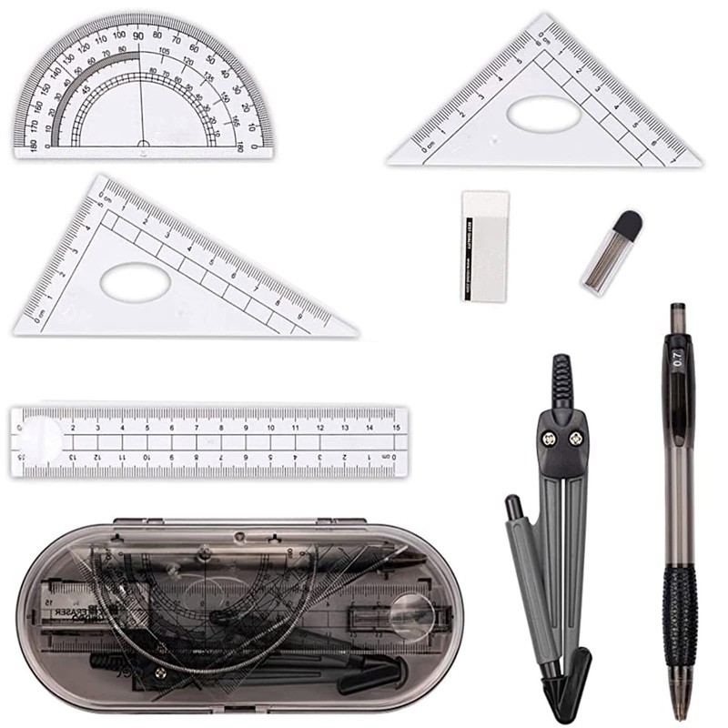 - A Variety of Learning Tools Our stationery box contains 8 different learning tools, 2 x graphic compass; 2 x triangle ruler; 1 x ruler; 1 x protractor; 1 x pencil; 1 x pencil refill; 1 x white eraser; 1 x sharpener; can meet different learning needs.