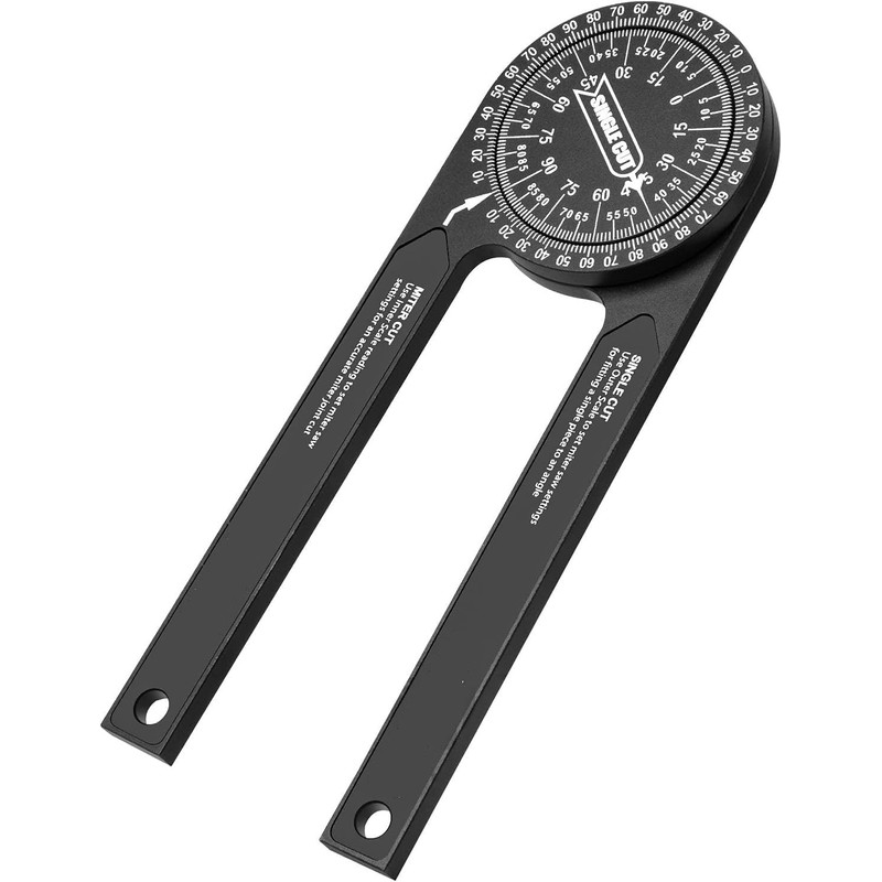 • '' Inch Miter Saw Protractor- Features easy-to-read precision laser engraved scales, protractor allows direct angle reading to the miter saw. Perfect for crown molding, trim work, and a variety of other carpentry applications. Miter Saw Protractor is of “O” shape design during operation and ensures smooth & precise read on inside/outside corners, Crafted from precision CNC-machined aluminum alloy.