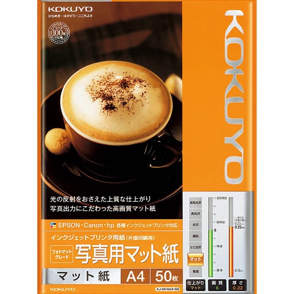 コクヨ コピー用紙 A4 紙厚0.22mm 50枚 写真用マット紙 インクジェットプリンタ用紙 KJ-M14A4-50