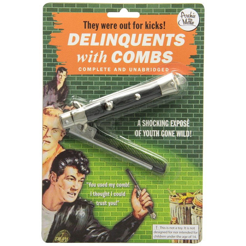 You've heard the stories: gangs of well-coiffed hoodlums terrorizing the streets with jars of pomade and pocket combs. It's about time you invested in some protection for your 'do. Each of these 9" (22.9 cm) long (when open), metal and plastic switchblade combs snap open with the push of a button and also features a safety lock to prevent unexpected deployment. Illustrated blister card.