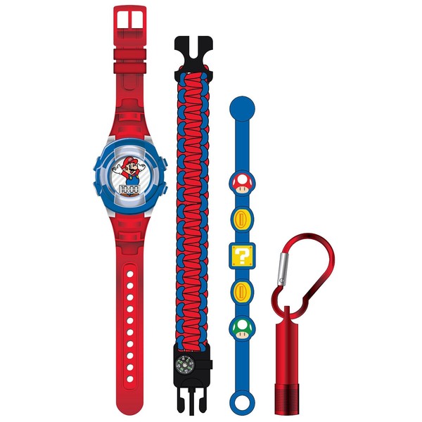 - LCD children's watch in stylish Super Mario design with digital display and flashing LEDs. The accessory set also includes a rubber strap, a cool survival bracelet and a mini torch