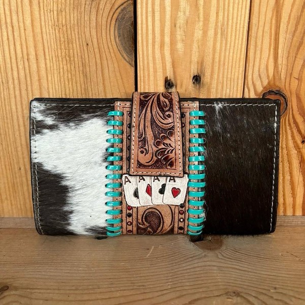 Stunning ACES leather wallet with tooled leather and cowhide accents! Snap closure. Multiple credit card slots, ID window, zipper coin pouch, and cash pockets.