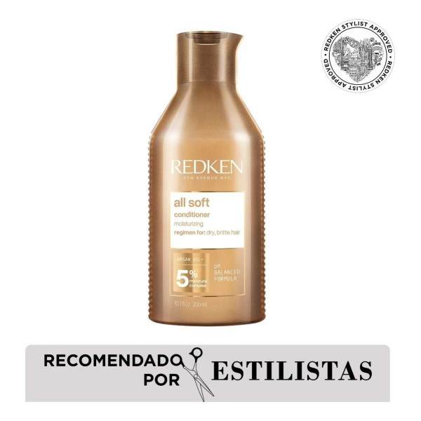 Acondicionador All Soft Redken 300 ml con tecnología de aceite de argán para transformar la textura del cabello seco y quebradizo, aportando suavidad y manejabilidad.