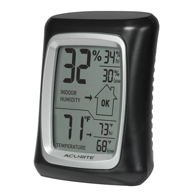 The AcuRite Digital Temperature & Humidity Monitor allows you to check comfortconditions at a glance with its wireless design that acts as an indoorhumidity gauge and indoor thermometer combination. Perfect for a bedroom, recroom, in-home weather center, or even an RV indoor-conditions station, thiswireless monitor always keeps you informed of current conditions. The humidityand temperature gauge can also be used for wine cellar monitoring, cigarhumidor monitoring, antique monitoring, or any environment where humiditylevels need to be measured.