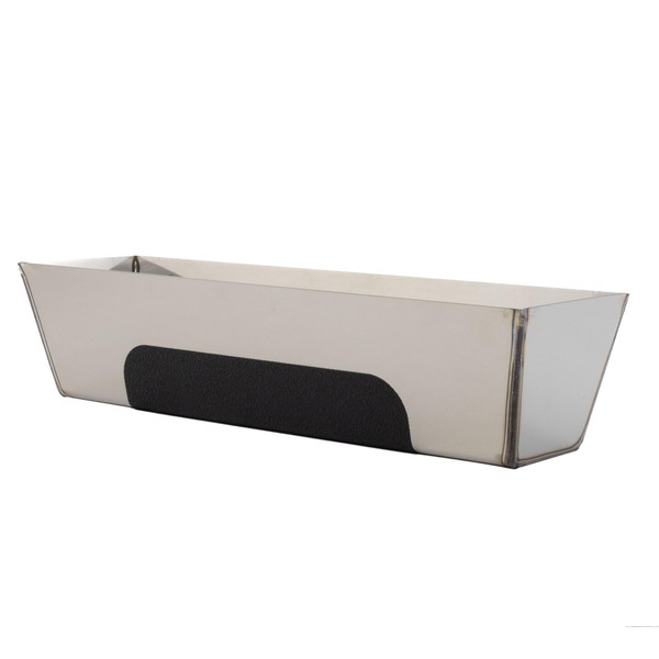 Advance Equipment 14-inch stainless steel contoured-bottom mud pan with non slip grip fits naturally in the hand, allows material to be scooped from the pan cleanly and easily. Other features include smooth tapered ends and sides, a heliarc weld that prevents leaking, and a top edge sheared to clean knife. Made in the USA.