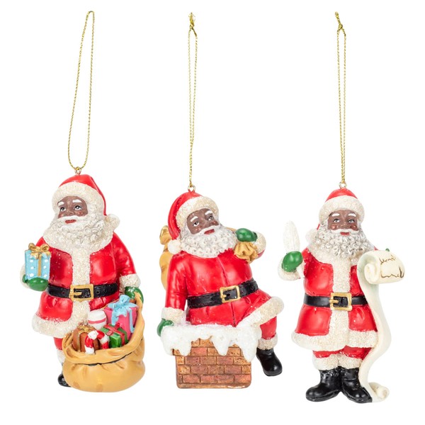 - Features a set of thee Black African American Santa ornaments; Jolly ole' Saint Nick in his traditional red and white suit and hat is checking his list, sorting his sack of toys, and climbing down the chimney on Christmas Eve on this beautiful trio of hanging ornaments