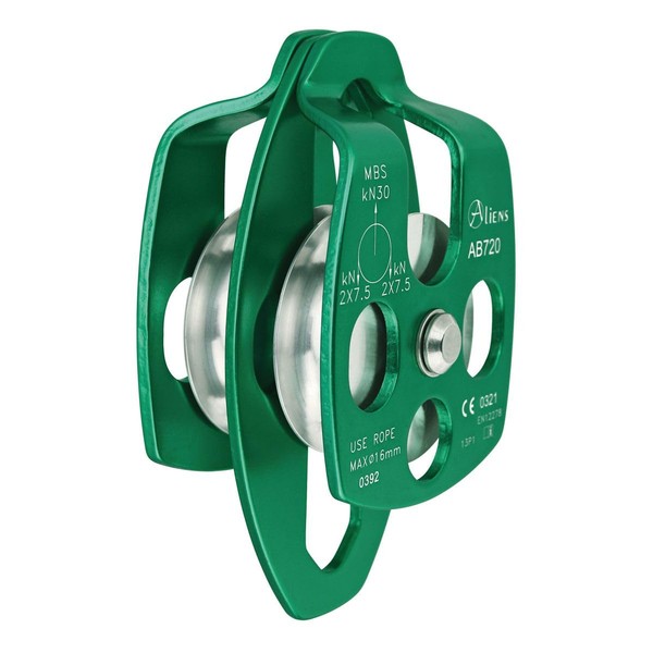 - The roller is equipped with a plain bearing for friction and low maintenance use. The side panels can be moved in opposite directions, so the roller can be placed on a rope at any point. The Aliens Big Double Pulley 30 kN pulley has a tab on the top and on the bottom in the optionally Multiple carabiner hooks can also be latched. Suitable for the construction of pulleys for lifting loads, lifting people, rope structures