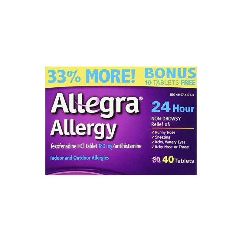 No somnoliento; El alivio de Goteo de la nariz, estornudos, picor, ojos llorosos, picazón en la nariz o la garganta; Bonus Pack - 33% más - 40 Tablets; 24 horas de protección - Interior y Exterior Tomar el control de sus alergias con Allegra no produce somnolencia. 24 horas de protección en interiores como en exteriores. El alivio de la secreción nasal, estornudos, picazón, ojos llorosos, picazón en la nariz o en la garganta. 33% Más Bonus Pack - 40 Tablets. Todos nuestros productos son de Estados Unidos SKU 23111803193