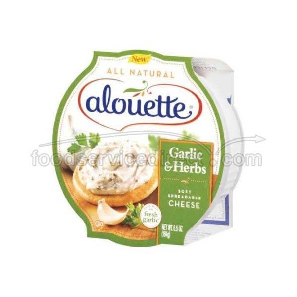 Alouette Garlic and Herb Spreadable Cheese - Bulk, 4.5 Pound -- 2 per case. Alouette Spreadable Cheese add life and flavor to any gathering with fresh, creamy taste and whipped texture for easy spreading. Made from the finest and freshest ingredients and with no artificial flavors or colors, Alouette Spreadable Cheese is ideal for enhancing the flavor of any entree or appetizer. The fresh cream used to make Alouette comes from the Amish farms in Lancaster County, Pennsylvania. This spreadable cheese has a delicious flavor of garlic and herb. Country of Origin - United States A Fresh and Creamy Taste with a Lactic Flavor, Milk Type - Cow