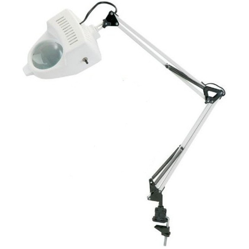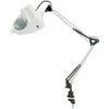 This swing arm magnifier lamp features a spring suspension system for easy adjustment of the lamp in any position. The arm height adjusts to 36 inches maximum. 4-inch diameter optically fine-ground 3-diopter glass lens has 1.75x magnification. Two-way mounting clamp for tables up to 1.5 inches thick. Uses a 60-watt bulb (not included). White body. ETL listed.