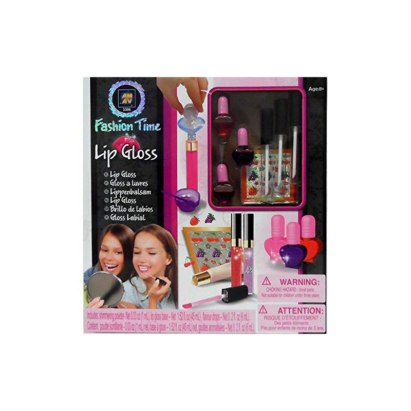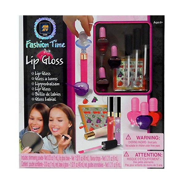 Make your own shimmering lip gloss with flavor. Kit includes 3 plastic bottles for lip gloss, 45ml gloss base, 3 2ml flavor drop bottles, a funnel, shimmering powder, measuring cup, wooden stick, stickers sheet, and instructions. Everything needed to make your own flavored lip gloss. Perfect for ages 8 and up.