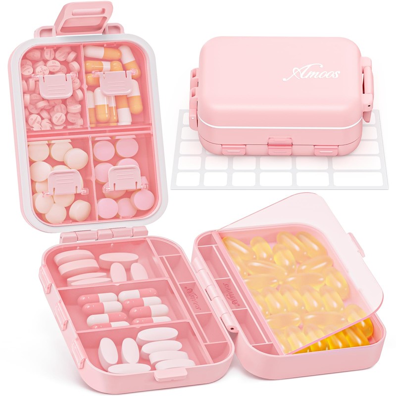 AMOOS Compact 3-Layer Travel Pill Organizer, Cute Pill Box Case with Pull-Tab Design for Easy Opening, Medication Organizer with 8 Compartments for Supplements, Vitamins, Fish Oils, 30 Labels