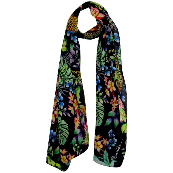 - JUNGLE QUEEN ARTWORK - An original artwork printed on a scarf to create a piece of art inspired by nature and vintage themes. Dive deep into the wild with leopards waiting in colorful, lush flora painted on a black surface