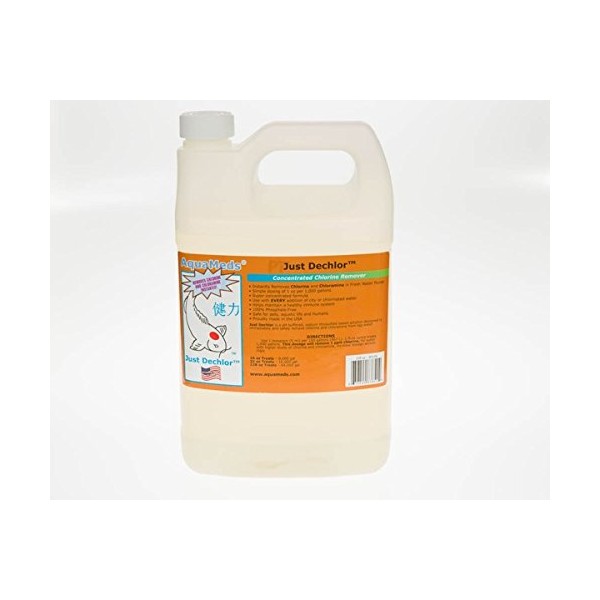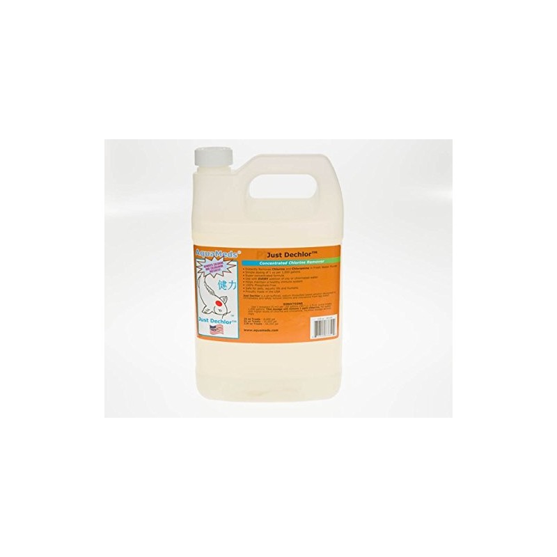 Just Dechlor by Aqua Meds Instantly Removes Chlorine and Chloramine in Freshwater and Ponds Simple Dosing 1 oz per 1,000 gallons Concentrated, Economical Formula Should be added for EVERY addition of chlorinated water 100% Phosphate Free Non-toxic to humans, pets or other aquatic life. Proudly made in the USA Just Dechlor is a pH buffered, sodium thiosulfate based solution designed to immediately and safely remove chlorine and chloramine from tap water. Use 1 teaspoon (5 ml) per 150 gallons (567 L). 1 fluid ounce treats 1,000 gallons. This dosage will remove 1 ppm chlorine, for water with higher levels of chlorine and chloramine, increase dosage accordingly.