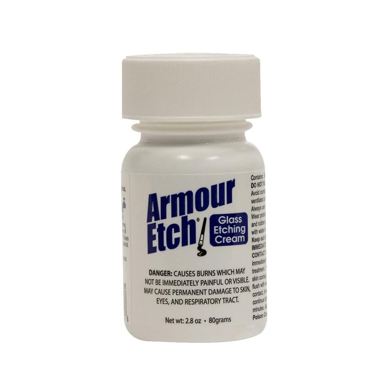 Armour Etch etching cream is a special formula that removes a fine layer of glass from glass to give them an etched appearance. It comes in a 2.8 oz. bottle with childproof cap. Any paper with a sticky back can become a stencil. Apply the cream with a brush and in 5 to 10 minutes your project will be etched. Instructions are included on the bottle. IMPORTANT SHIPPING NOTE: Government restrictions prevent shipping many products by AIR, including Armour Etch. This item CANNOT BE SHIPPED to Alaska or Hawaii, or outside the U.S. with the exception of UPS ground shipments into most areas of Canada.