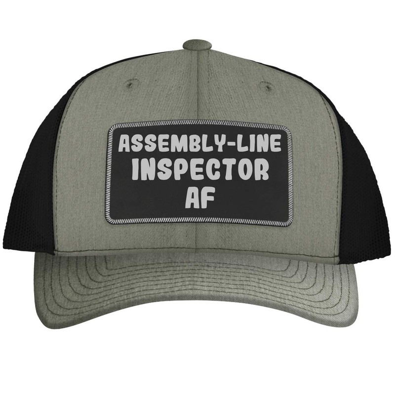 Assembly-Line Inspector AF - Leather Black Patch Engraved Trucker Hat, Heathe...