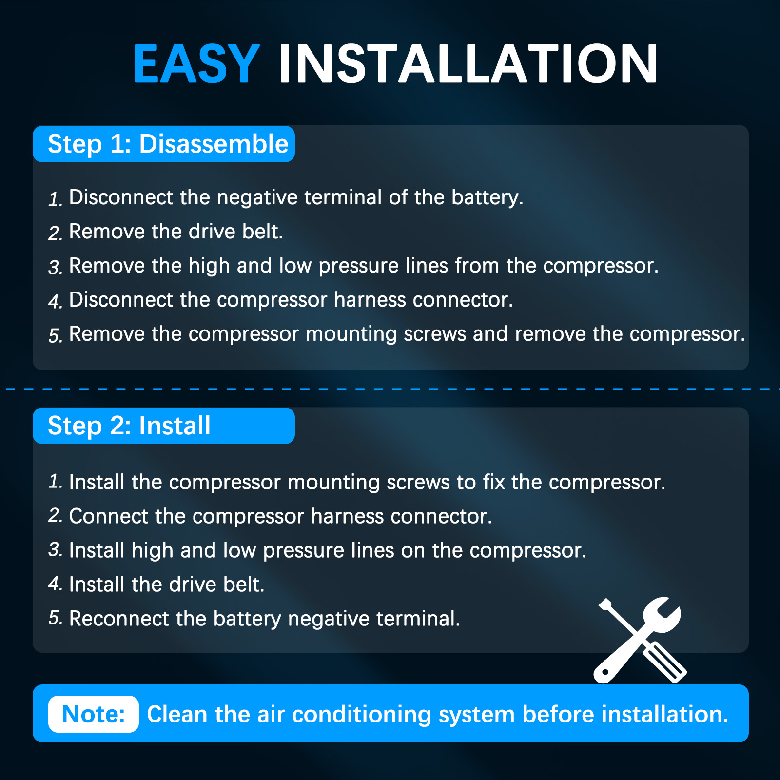 1. Please confirm compatibility before purchasing to ensure correct fitment. 2. Please ensure the installation site is clean otherwise it will lead to the high temperature of the compressor and the melt of the clutch. 3. Noise, vibration, durability, vacuum decay, and pressure decay need to be tested to ensure no leaks and keep longer life of the compressor. 4. It is strongly recommended to conduct professional maintenance and installation.