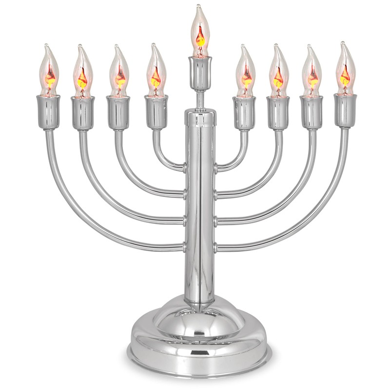 Aviv Judaica 12" Quality Chanukah Menorah Round Base Highly Polished Chrome Plated Electric Menorah with Flickering Bulbs Candles for Chanukah Hanukkah Lights Menorah Chanukkah Decorations