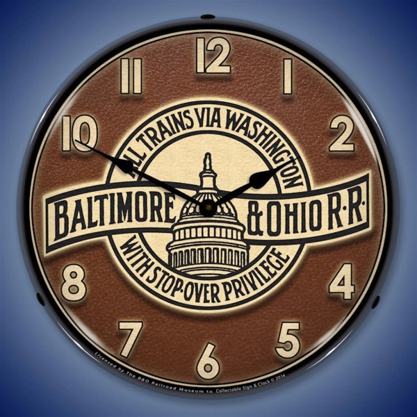 This B&O Railroad 3 Wall Clock, LED Lighted is a 14 inch backlit LED lighted clock manufactured in America. The clock has an antique, vintage look and feel to it..