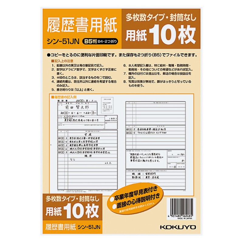 コクヨ 履歴書用紙 多枚数 B5(B4・2つ折り) 10枚 シン-51JN