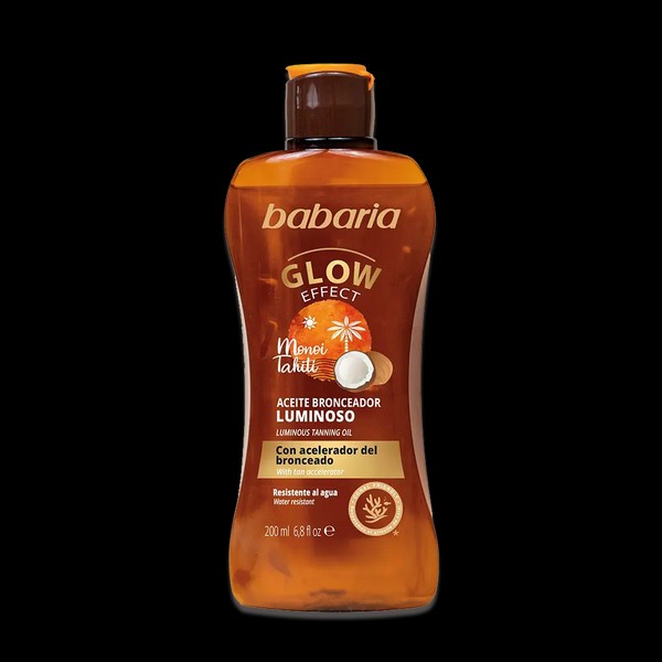 The Babaria Glow Effect Tanning Oil Gel is your ultimate secret for a deep, radiant tan with a subtle shimmer. This tanning gel-oil combines coconut oil, aloe vera, and carrot oil (beta-carotene) to deeply hydrate the skin and accelerate a long-lasting tan. Perfect for sun lovers with already tanned skin who want to deepen and extend their glow.
