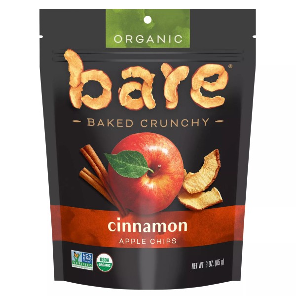 USDA Organic. Certified Organic by ASCO. Gluten free. Fat free. Good source of fiber. No added sugar (Not a low calorie food. See nutrition information for calorie and sugar content). Non-GMO Project verified. Made of Apples & Cinnamon: A delicious blend of real apples with a dash of cinnamon spice, baked 'til they're crave-ably crunchy. With bare, less is more. The Bare Facts: No preservatives. Baked, never fried. Follow us (at)baresnacks. . . Visit us at