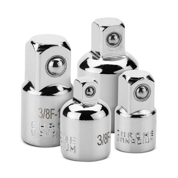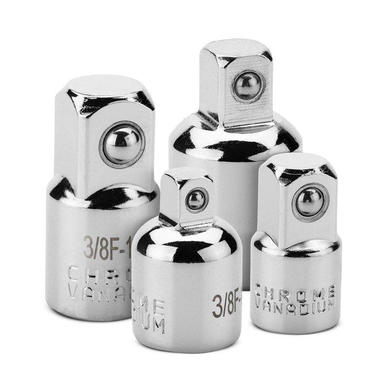 - This 4-piece set includes 1/2" Drive (F) to 3/8" Drive (M) reducer, 3/8" Drive (F) to 1/4" Drive (M) reducer, 3/8" Drive (F) to 1/2" Drive (M) adapter, 1/4" Drive (F) to 3/8" Drive (M) adapter, to give you all the sizes you need for transition from socket to socket smoothly.