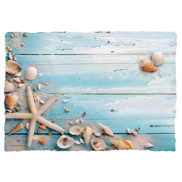 - Enhance any table setting with these lovely beach seashells paper placemats. Featuring an airy, ocean-inspired design with exotic seashells, starfish, and a blue boardwalk background, these disposable paper placemats are ideal for seafood restaurants, tropical resorts, wedding receptions, and other beach-themed or summer events. They are printed on standard bond paper. Dimensions are 9.75 x 14 Inches.