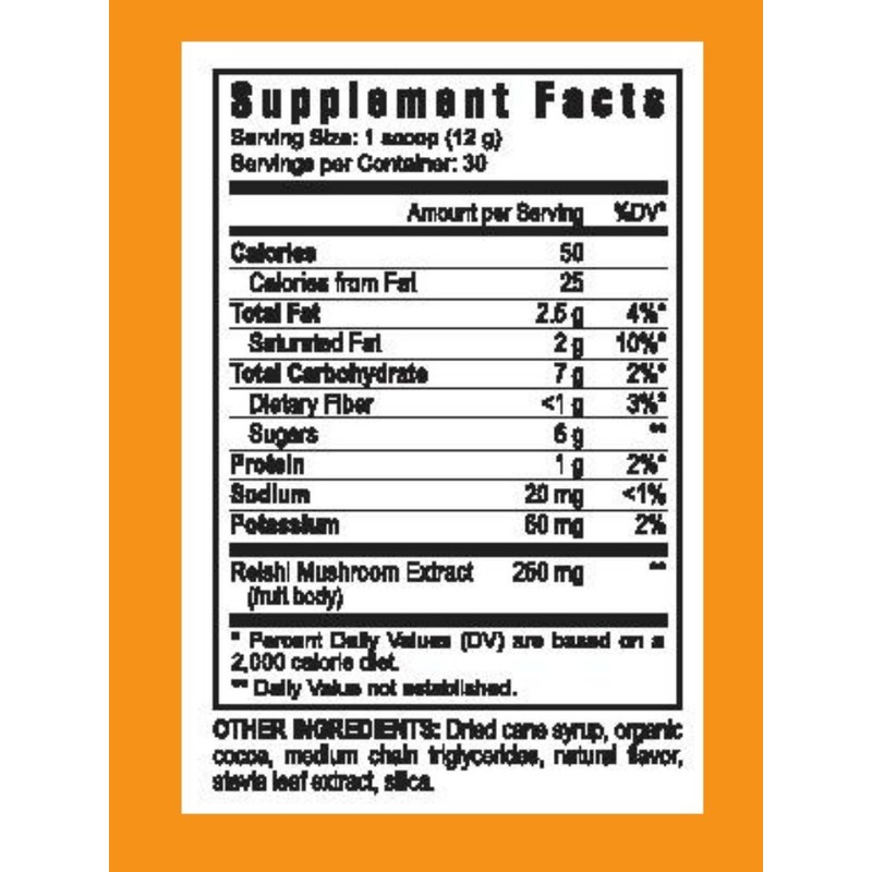 - Sodium, Potassium, Reishi Mushroom Extract, Dried Cane Syrup, Organic Cocoa, Medium Chain Triglycerides, Natural Flavor, Stevia Leaf Extract, Silica