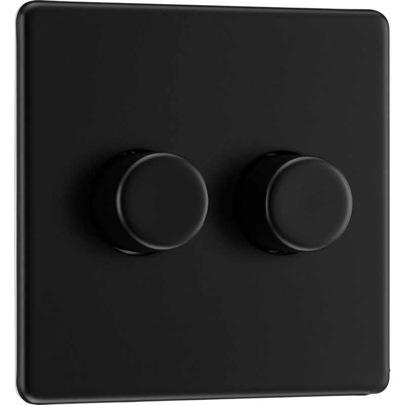 - SCREWLESS DOUBLE DIMMER SWITCH WITH LOW PROFILE FROM THE BG FLATPLATE RANGE: 200W dimmer switch in matt black that is designed to sit flush to the wall with a front plate which clips on/off easily – giving a clean look that exudes modern elegance