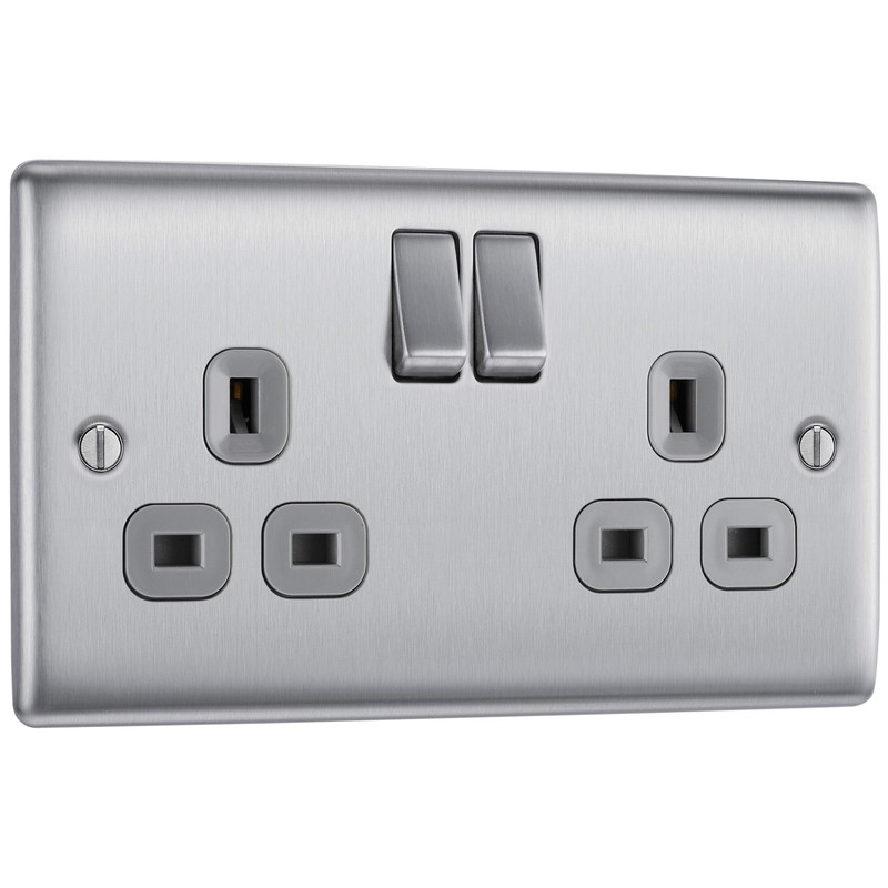 - SLEEK AND SLIM BRUSHED STEEL DOUBLE SWITCHED POWER SOCKET: From BG Electrical, has softly rounded corners and colour matching fixing screws – combining quality with modern elegance