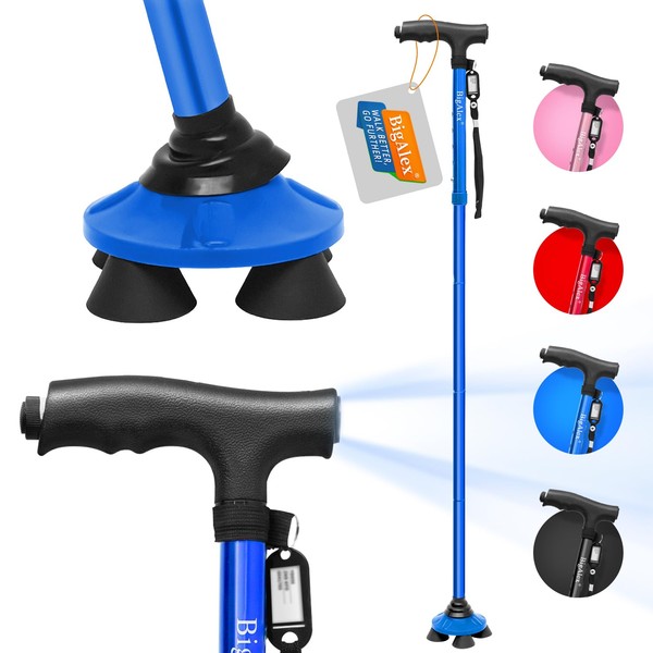 ビグアレクス(BigAlex)ステッキ 杖 自立伸縮折りたたみ杖 LED ライト 軽量 アルミ 長さ調整可能 高齢者 夜間散歩 歩行支援 収納袋付き 花火大会 母の日 父の日 敬老の日 プレゼント (ブルー x 1(75-85cm))
