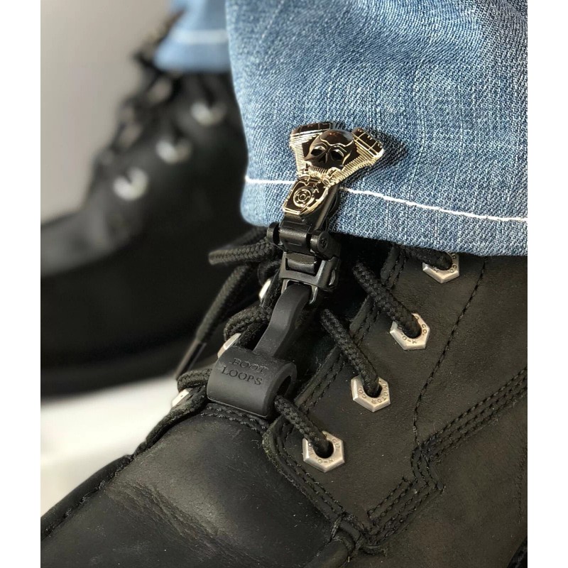 Our all new weather proof Boot-Loop products hold your pants in place by using the laces on your boots. This application stays connected to your boots for easy installation and comfort during the ride.
