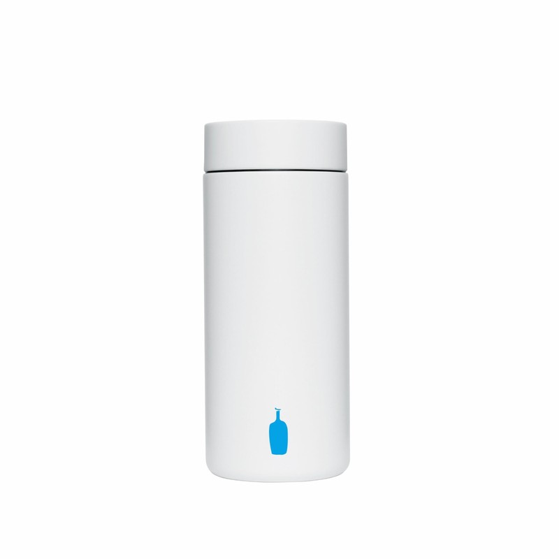 This tumbler has a simple design with a blue bottle coffee logo on a pure white body.