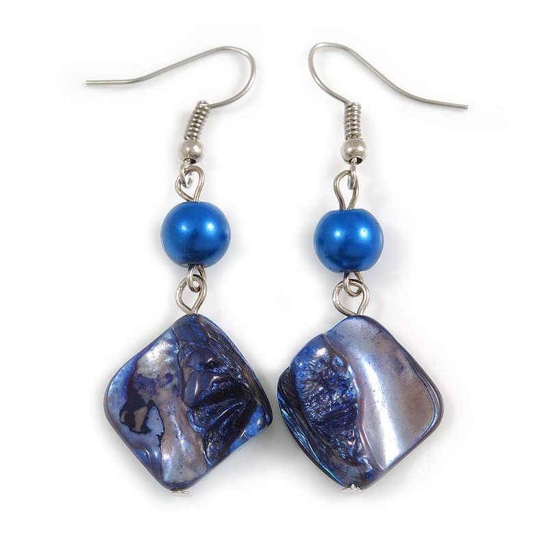 Blue Shell Bead Drop Earrings In Silver Tone - 60mm Long