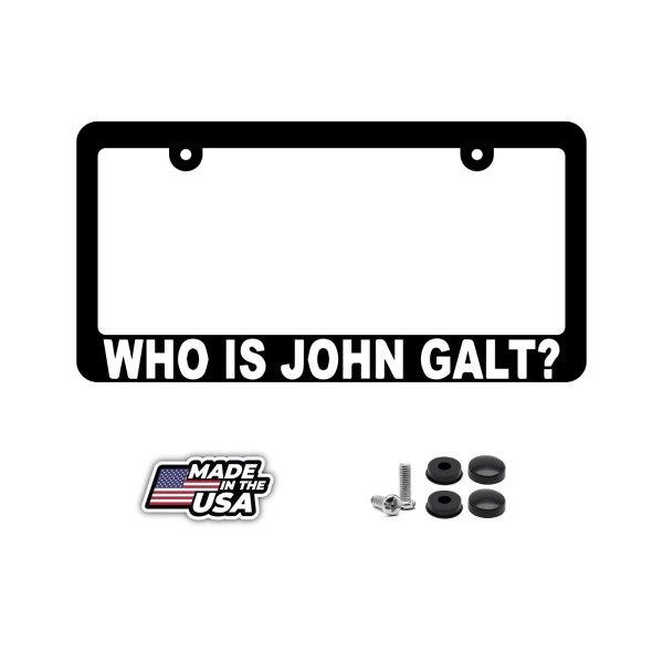 Show off your love for Ayn Rand's famous novel with this sleek black license plate frame featuring the phrase "WHO IS JOHN GALT?" The frame is made of durable ABS material and fits most standard license plates. It is designed by BLVD and manufactured with the part number 45.This license plate frame is perfect for any fans of Ayn Rand or those who simply appreciate the powerful message behind the phrase "WHO IS JOHN GALT?" It is a great addition to any vehicle and will surely turn heads on the road. Get yours today and showcase your unique style.