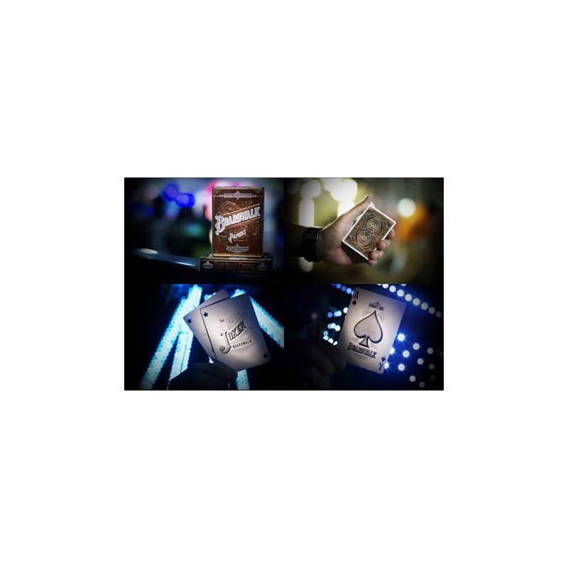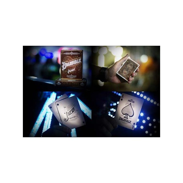 The Boardwalk Papers deck was inspired by boardwalks and small theme parks of yesteryear, with a really fun vintage vibe. The back design, tuck, Ace of Spades, and Jokers feature fully custom & hand-drawn artwork by Drew Melton with enhancements by Randy Butterfield. The back looks AWESOME in a vintage-style two-tone brown design. The tuck box has gorgeous Gold and White Foil, plus embossing and inside printing, and we've topped it off with a custom seal. All of the faces (Courts and spots) are standard design with a custom color scheme.