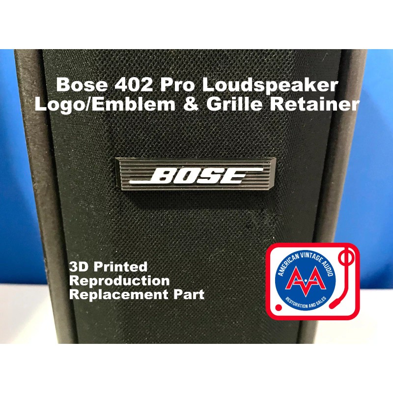 Bose 402 Speaker Logo/Emblem & Grille Retainer NEW Replacement PartThese occasionally get damaged, broken, or lost, so we reproduced this part through 3D Printing.  This part is not only a Cosmetic Emblem, but it also secures the Front Grille to the speaker, and it can be rotated 90 degrees if desired, just like the original.  This part Restores Functionality, and the fit and finish is perfect, though you may see some blemishes/marks on the back from 3D printing.  See Photo's for more details and cosmetic finish.