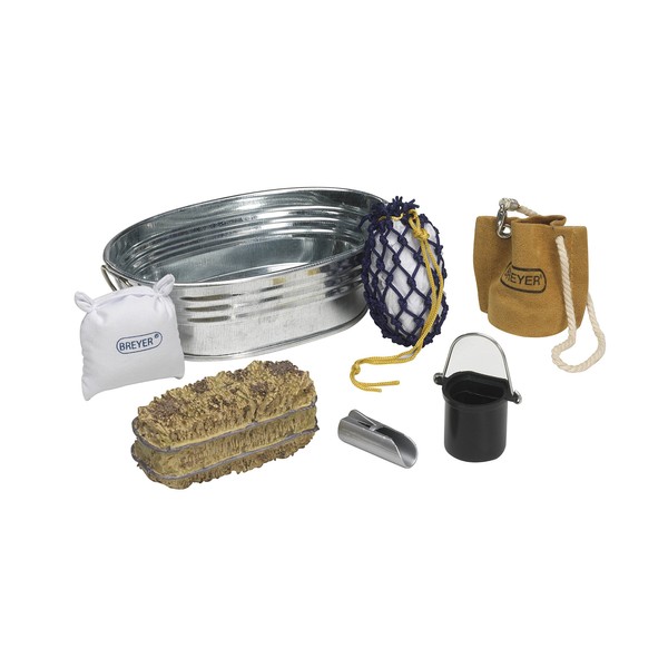 Keep your Breyer model horses fed and happy with this Stable Feeding Set. 7-piece set includes aluminum water trough, hay bale and hay net, feed bucket, feedbag, bag of feed and feed scoop. Each item is authentically-styled to look just like the real thing! Items in this kit are sized for Breyer Traditional Series (1:9 scale) horses and 8” riders. Add to your model horse barn for the most realistic play experience! Horse and barn not included. From the manufacturer: Breyer is the maker of the world’s finest model horses! Since 1950, Breyer has brought a wide range of horse breeds from around the world to life for play and collecting – including real horse heroes like racehorse Secretariat, Olympian Valegro, and reining superstar Big Chex to Cash! The Traditional Series offers an unmatched level of realism and attention to detail that is appreciated by children and adults alike. Each 1:9 scale model is meticulously hand-painted in rich colors, so no two are exactly the same. Breyer has an incredible community of model horse fans, artists, and collectors, and is proud to host BreyerFest: a three-day extravaganza for horse lovers and Breyer enthusiasts each July in Kentucky! Bring home a Breyer model, and let your imagination run free!